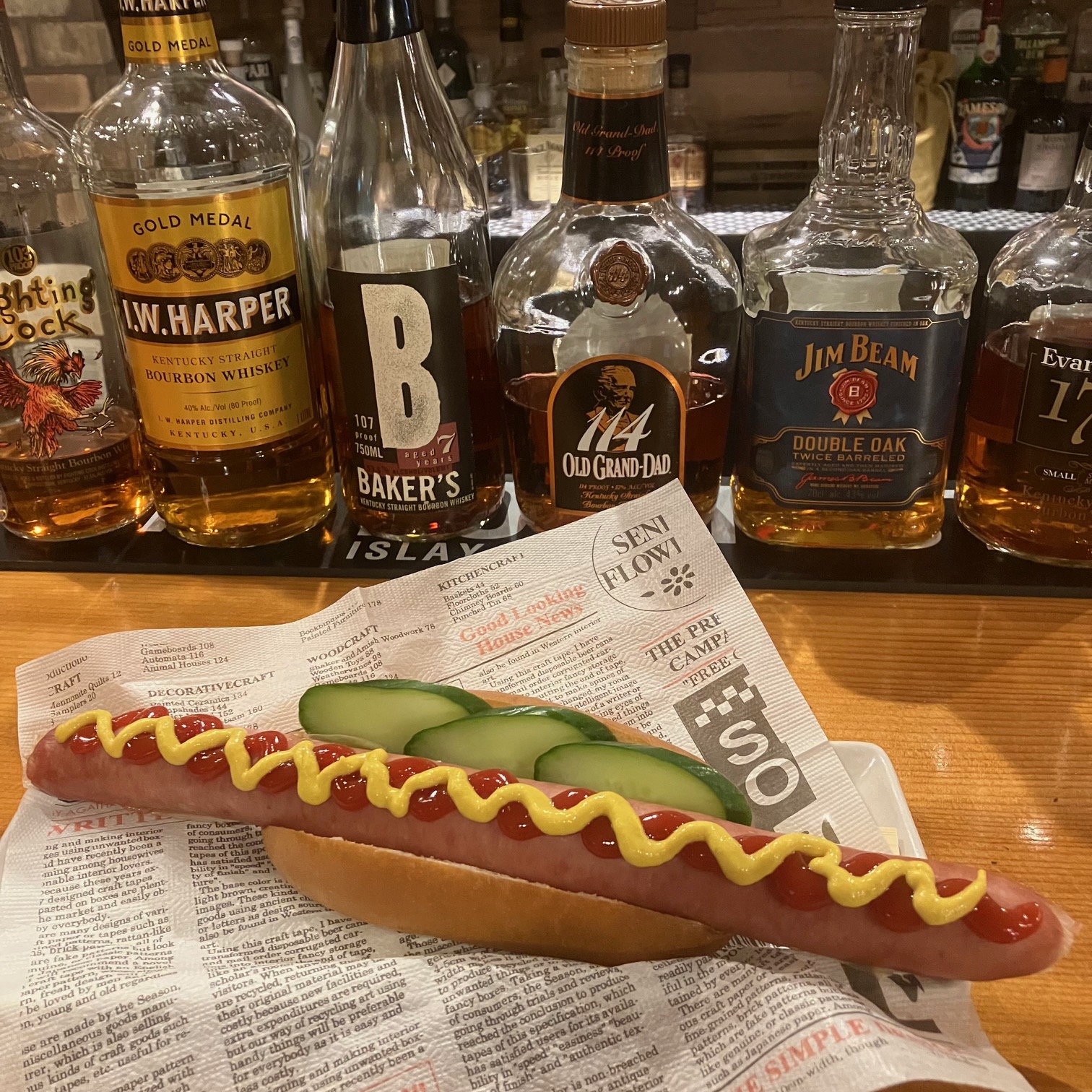 お店の看板メニューでもある宮城県大河原町のもち豚で作ったソーセージで、どデカいホットドックを準備いたします!