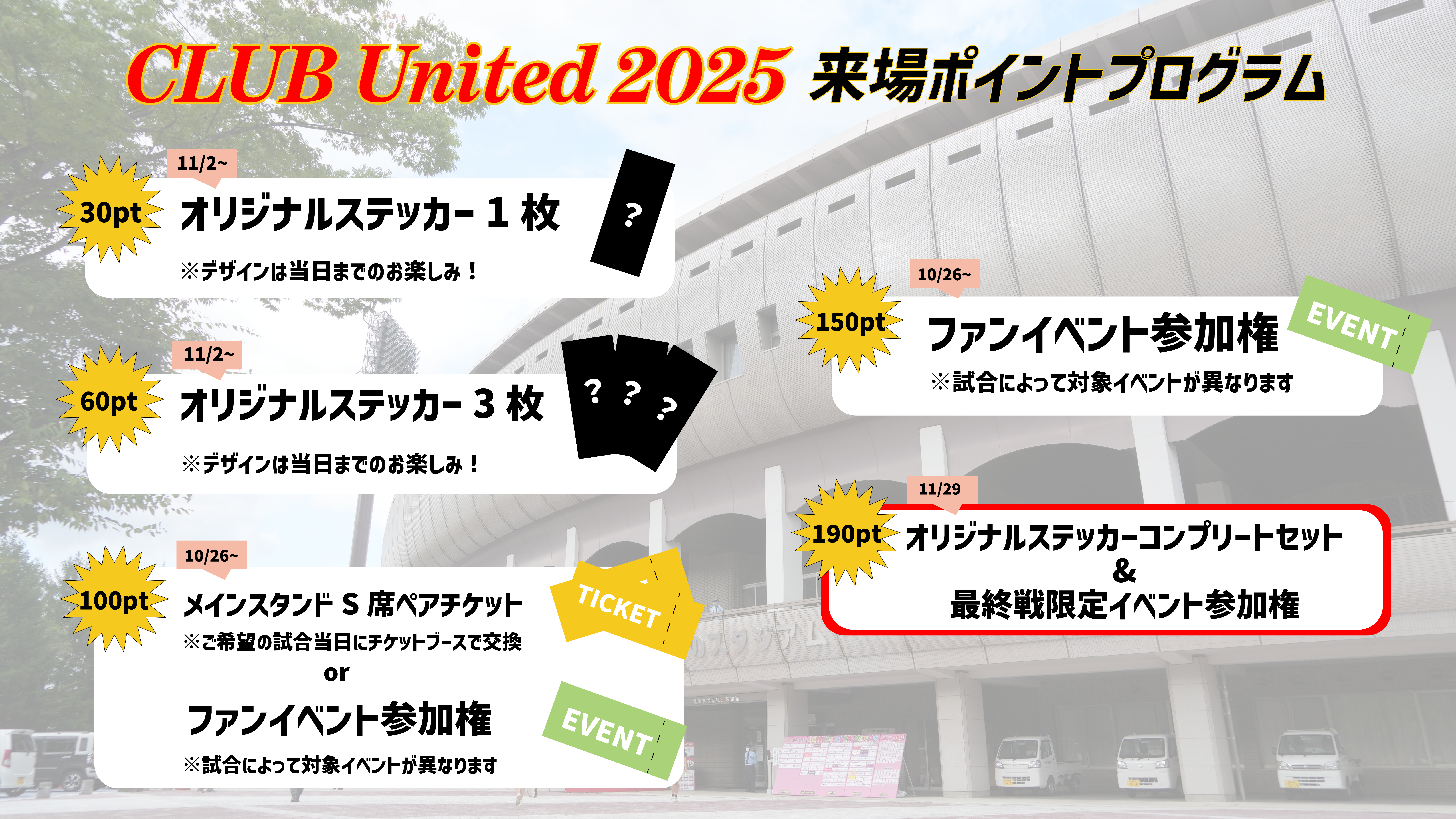 公式ファンクラブ『CLUB United 2025』の来場ポイントプログラムが決定しましたので、お知らせいたします。