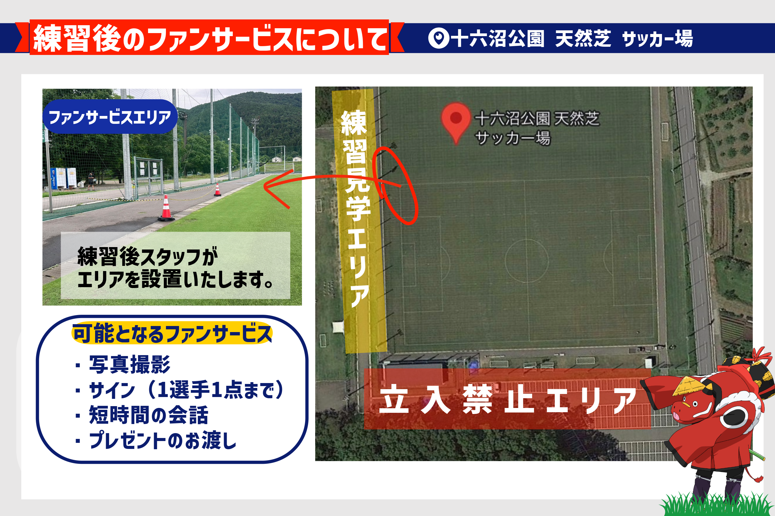 先般、十六沼公園天然芝付近において、熊の目撃情報があり練習見学およびファンサービスを中止しておりましたが、現時点(10月31日現在)で新たな目撃情報がないこと、施設職員による巡回を実施していることを踏まえ、11月3日(月・祝)より練習見学およびファンサービスを再開いたします。