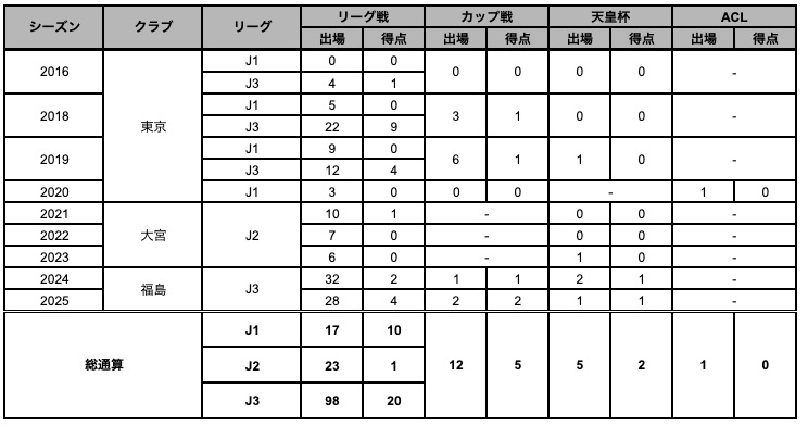 【サッカー歴】⼋王⼦ CBX FC→FC 東京 U-15 むさし→FC 東京 U-18→中央⼤→FC 東京→⼤宮アルディージャ→福島ユナイテッド FC