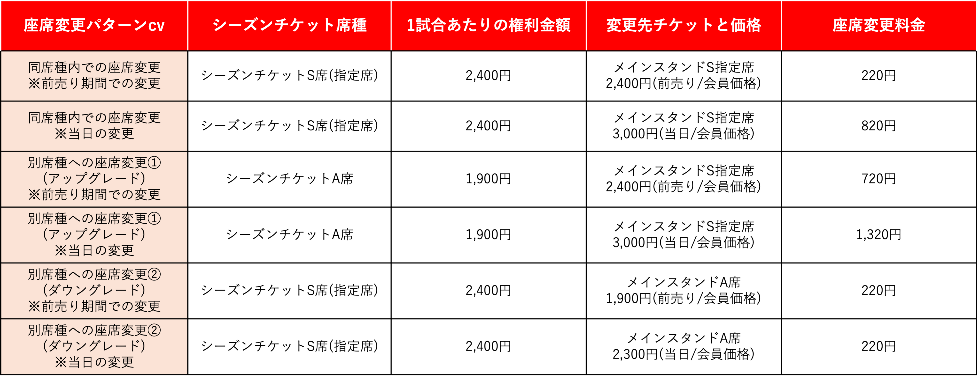 ・同席種内での座席変更(例:メインスタンドS指定席からメインスタンドS指定席)