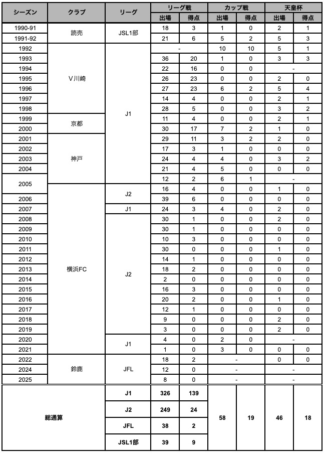 【代表歴】⽇本代表(1990 年〜2000 年)国際Aマッチ 89 試合出場/55 得点、フットサル⽇本代表(2012 年)