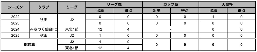 【サッカー歴】寺内ブルーウィングスサッカースポーツ少年団→ブラウブリッツ秋田U-15→ブラウブリッツ秋田U-18→ブラウブリッツ秋田→みちのく仙台FC→ブラウブリッツ秋田