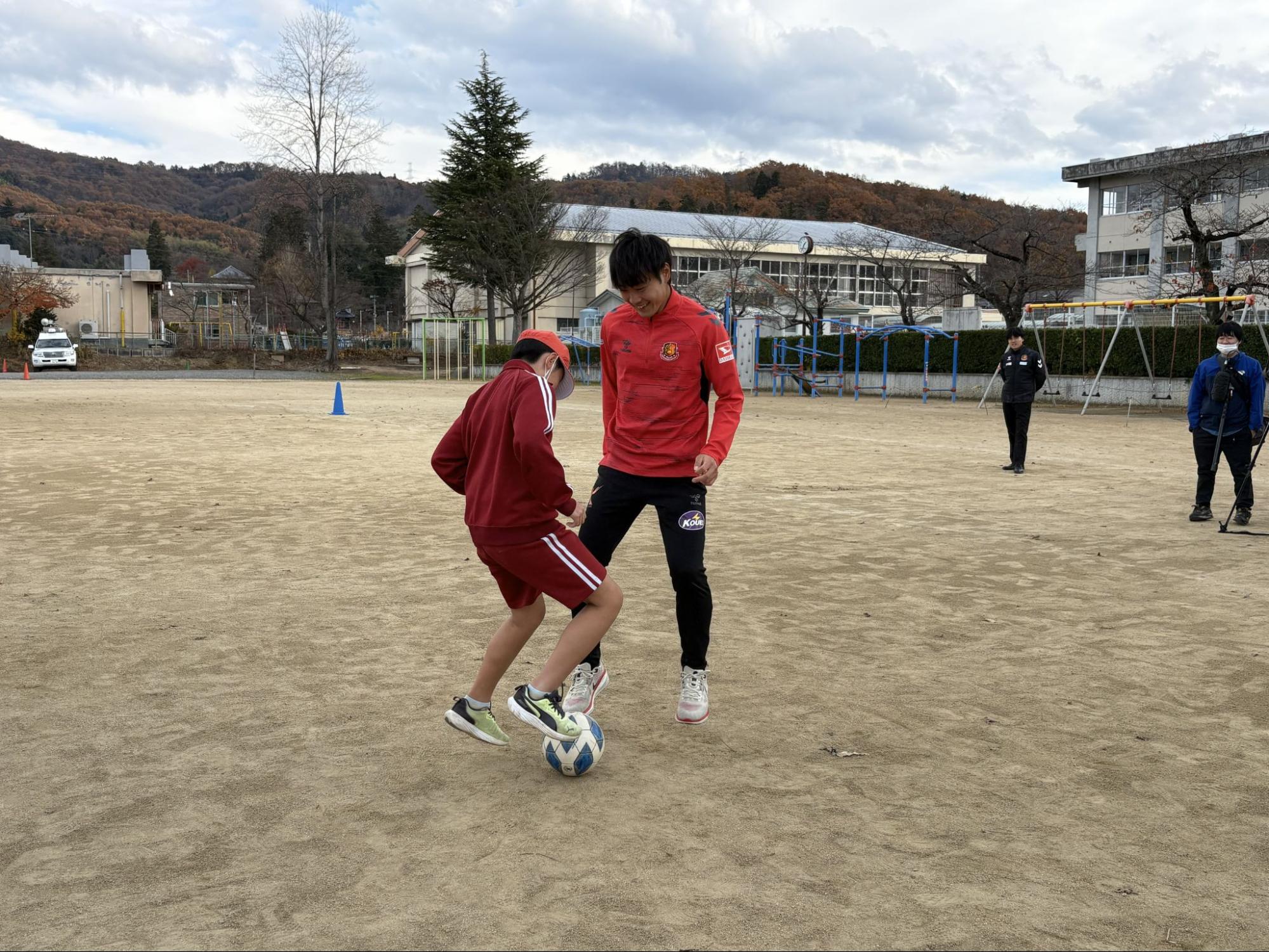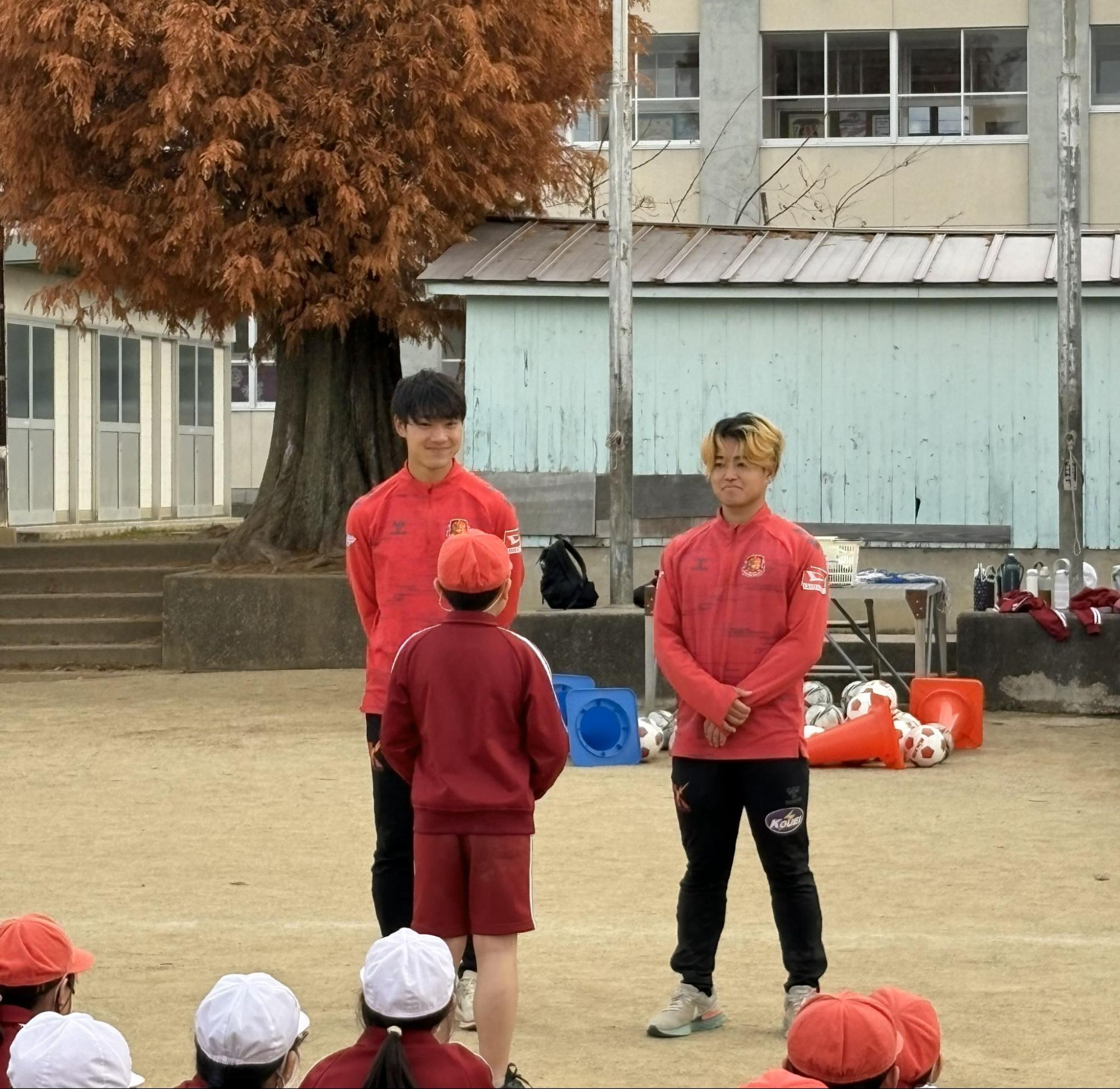 今回は鈴 直樹 、飯島 陸の2選手が講師を務め、87名の子どもたちにサッカーの授業を実施しました。