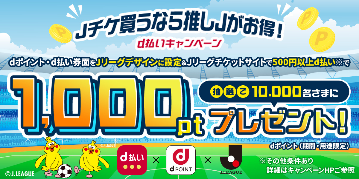 dポイントまたはd払いのアプリ券面を推しJ券面(クラブ名)に設定の上、Jリーグチケットサイトにて「d払い」で500円(税込)以上お支払いいただいた方の中から、抽選で10,000名さまにdポイント(期間・用途限定)1,000ポイントを進呈いたします。
