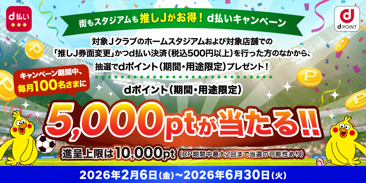 dポイントまたはd払いのアプリ券面を推しJ券面(クラブ名)に設定の上、対象店舗(d払い×クラブ応援店および対象クラブのホームスタジアム※)にて「d払い」で500円(税込)以上決済された方の中から、毎月抽選で100名様(総計500名様)にdポイント(期間・用途限定)5,000ポイントを進呈いたします。