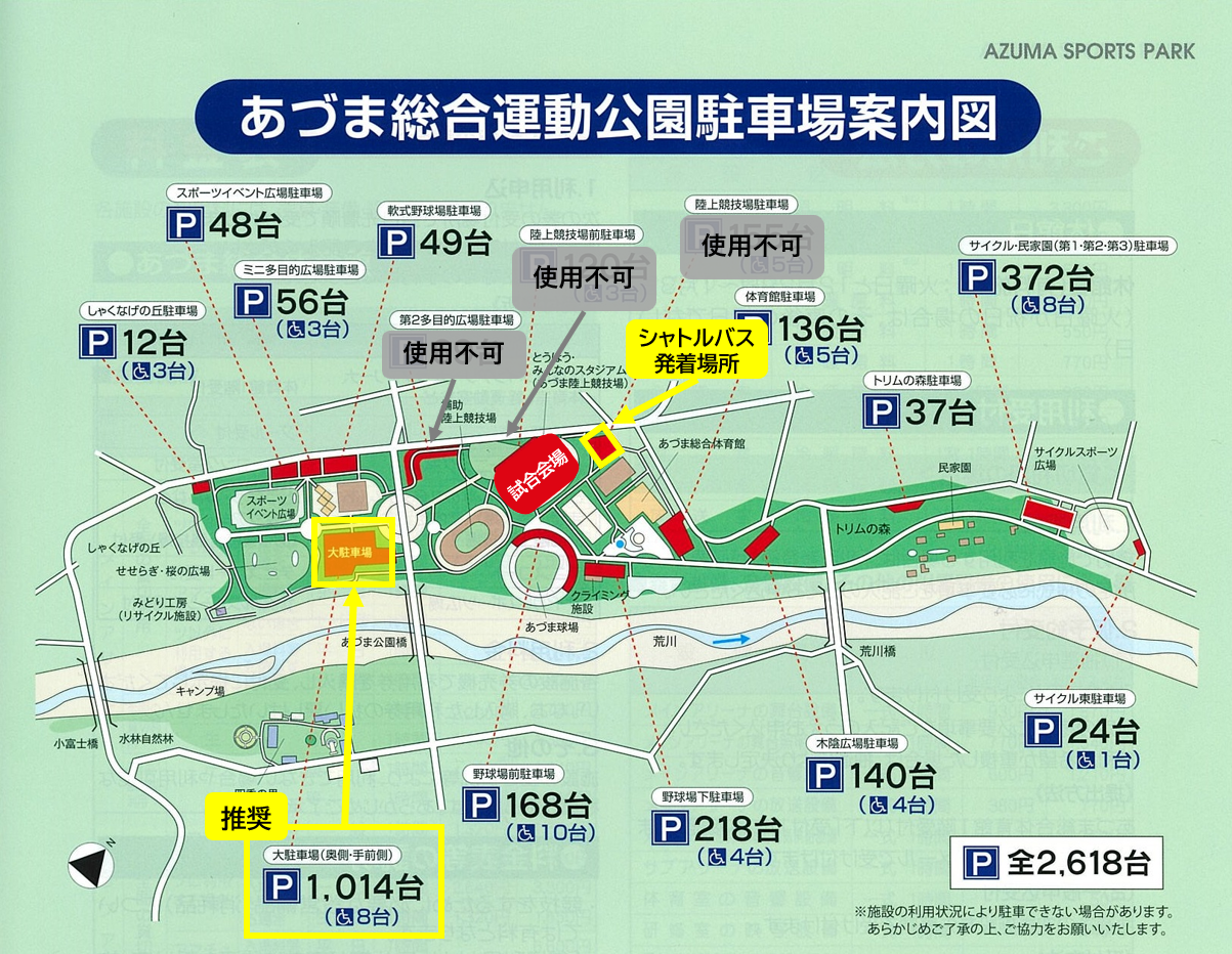 ※第2多目的広場駐車場、陸上競技場前駐車場、及び陸上競技場駐車場(シャトルバス発着場所)は、関係者駐車場として使用するため利用できません。