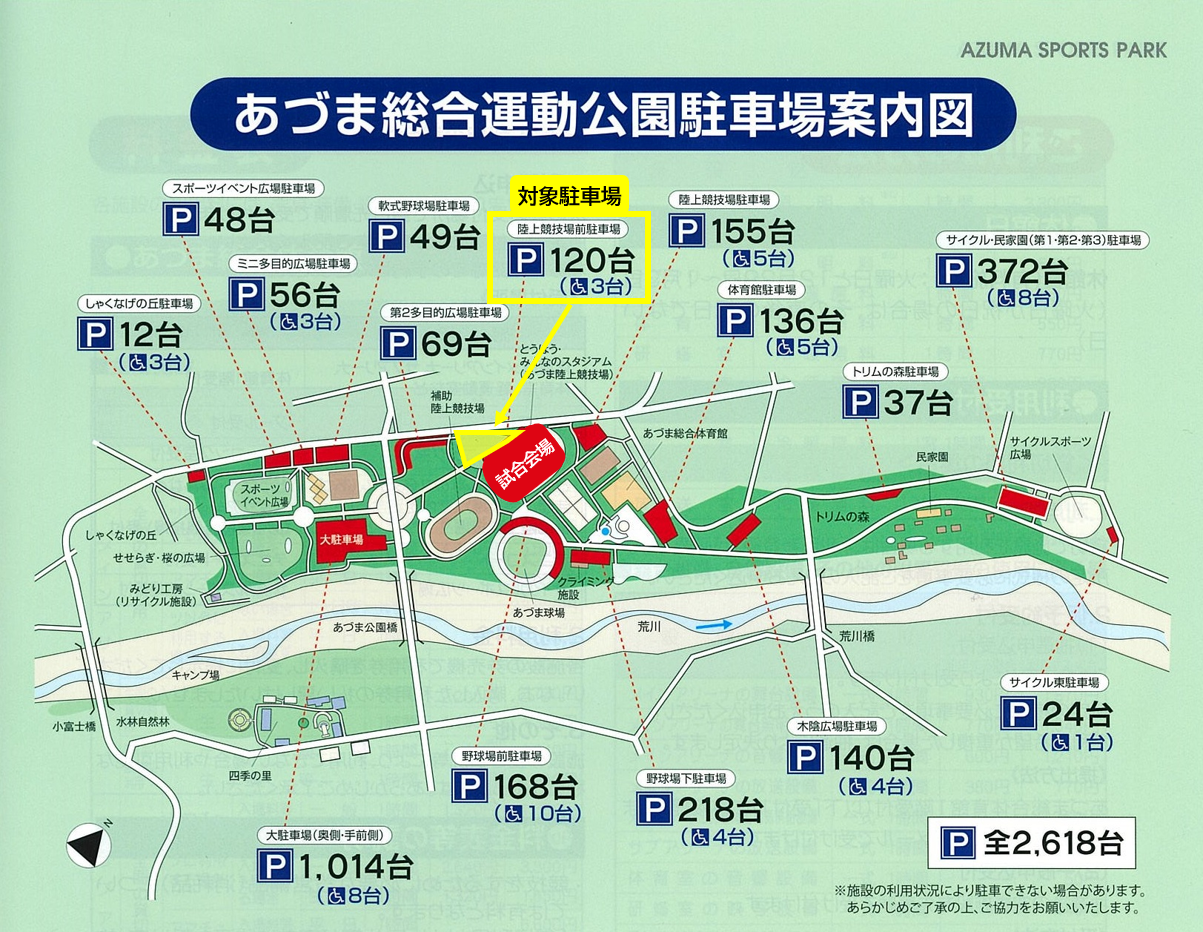 「陸上競技場前駐車場」の他、あづま総合運動公園内・各駐車場においても、車椅子駐車場をご用意しておりますので、あわせてご利用をご検討いただけますと幸いです(事前申込なし・先着順)。