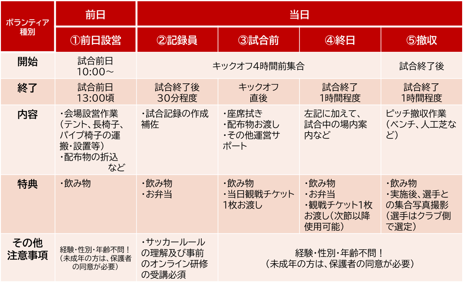 ・「①前日設営ボランティア」は、4月開催分は、10:00開始となりますのでご注意ください