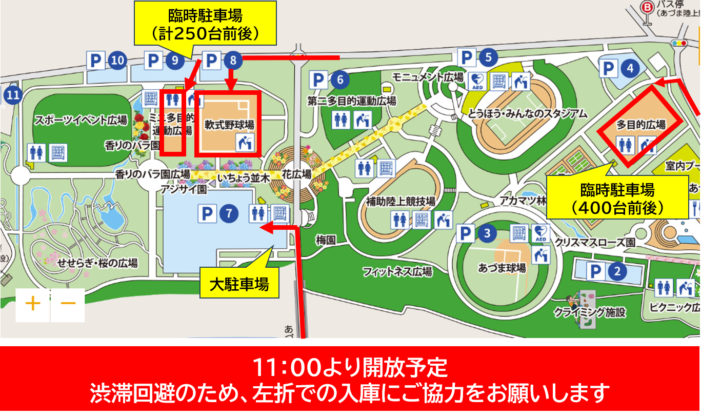 今節は非常に多くのご来場が予想されるため、あづま総合運動公園内の臨時駐車場の開放を予定しています。