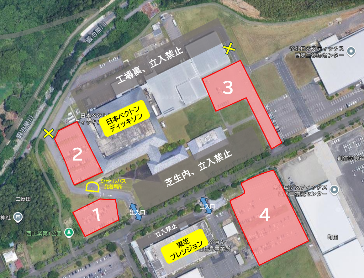 スタジアムから車で約10分の福島西工業団地内、日本ベクトンディッキソン福島工場、および東芝プレシジョン株式会社・本社福島事業所を臨時駐車場として、ご利用いただけます。