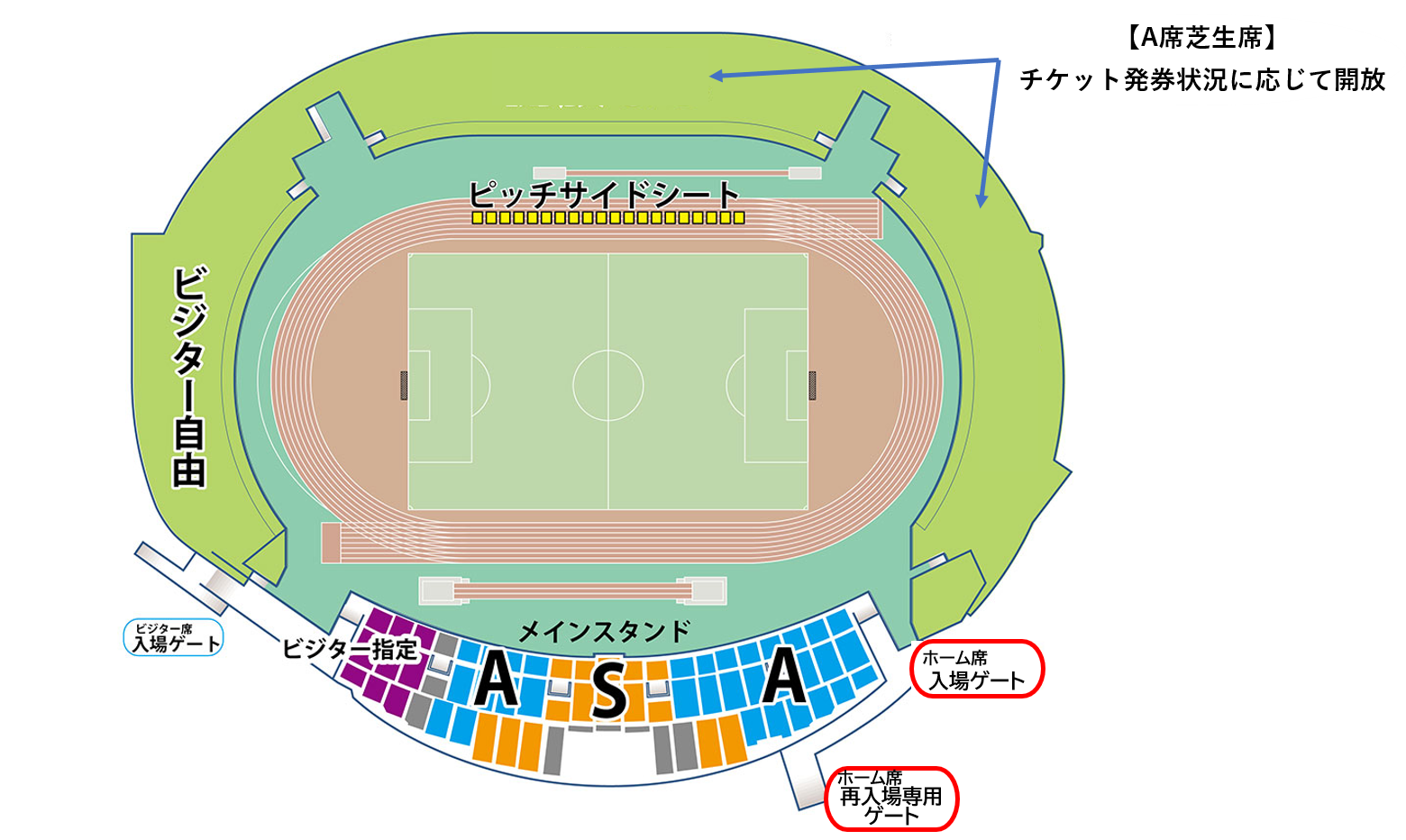 今節は、多数のご来場が見込まれるため、開場後にホーム側芝生席をA席として開放する可能性がございます。メインスタンドA席のチケットをお持ちの方は、芝生席をご利用いただけます。当日、芝生が湿っている場合もございますので、レジャーシート等をご持参することを推奨いたします。