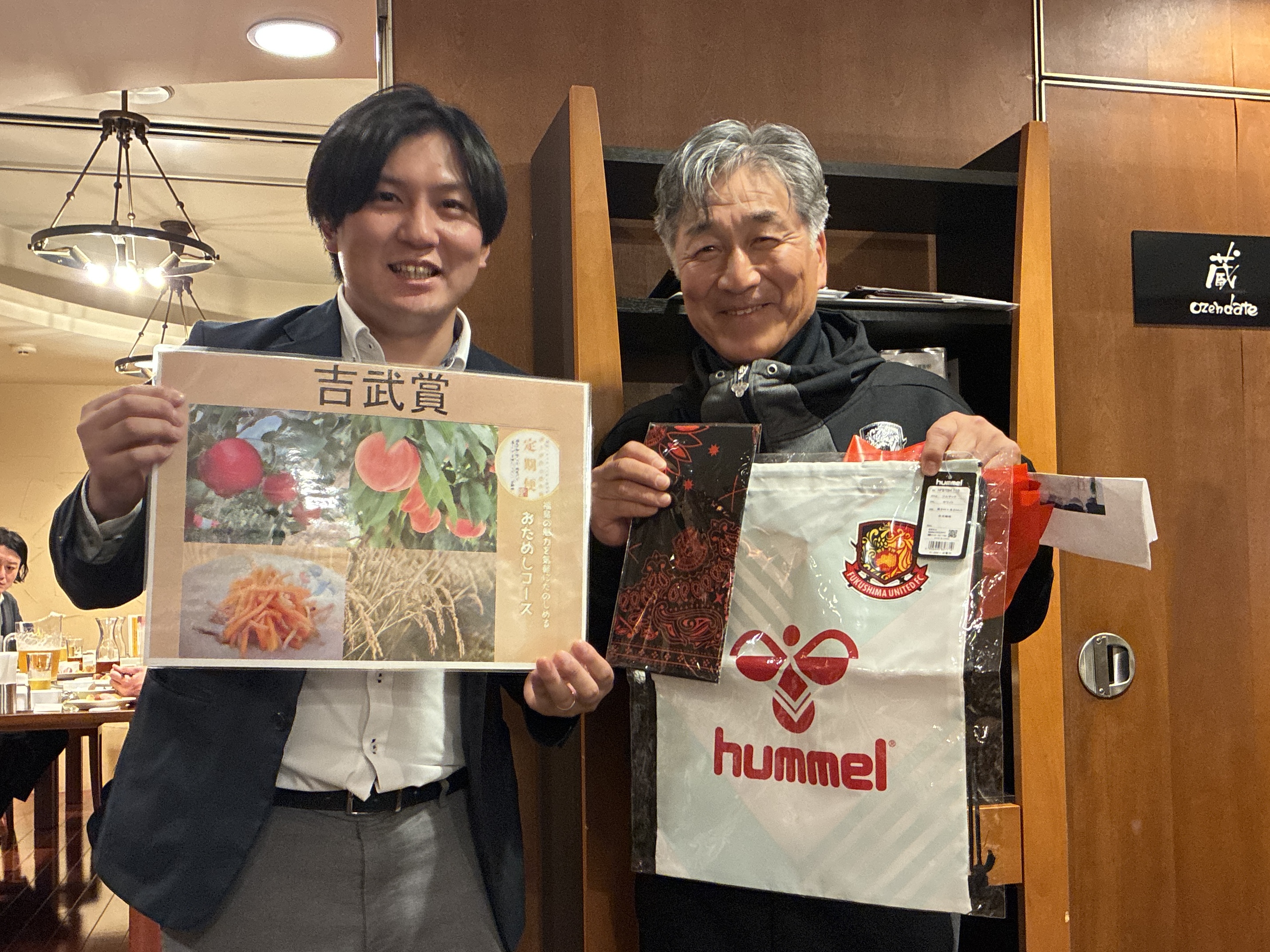 エキシビジョンマッチ後はサポートコーポレーション ブロンズのozendate MASUZOにて懇親会を行いました。ピッチの上で共に汗を流し、サッカーを通じて芽生えたみなさまとの絆をさらに深く結びつける大変有意義な時間となりました。