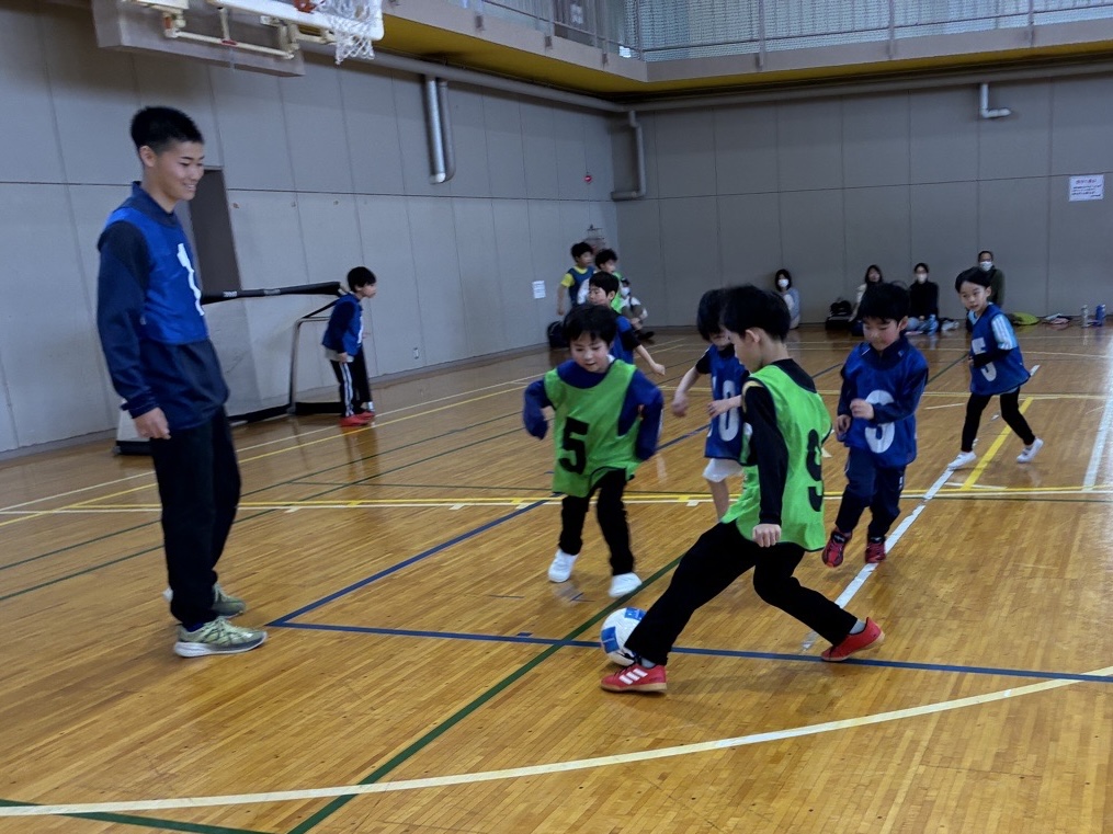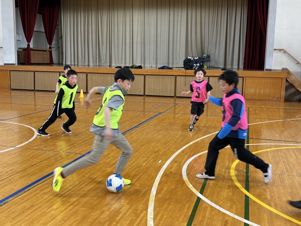 天候の影響で、梁川体育館での実施となりましたが、たくさんボールと触れ合い楽しんでいる様子が印象的でした。特に、最後の試合は多くのゴールが生まれ大いに盛り上がりました。